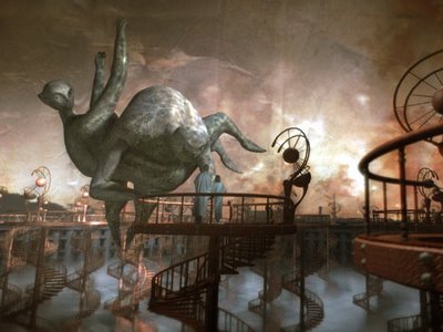 A screen shot from the movie, 'Mirrormask'. The whole composition of the scene looks exactly like a painting by Dave McKean.